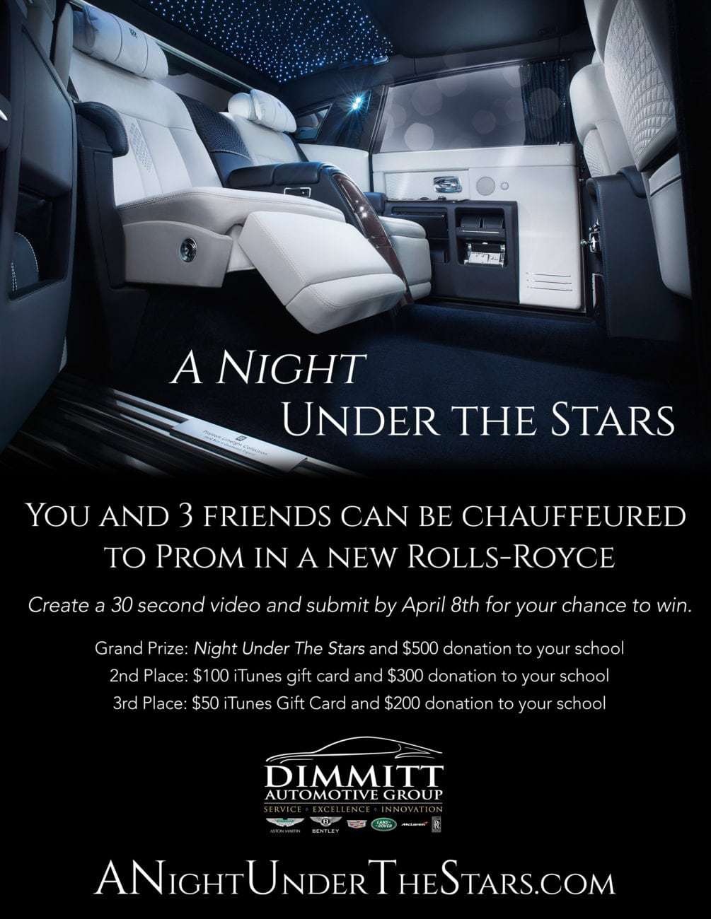 By emailing Dimmitt Automotive Group a link to an entry video or posting on our Facebook page, you agree to our Terms & Conditions. Winners will be notified and the results will be published on the Dimmitt Facebook page by April 12th. The Grand Prize Winner and 3 friends will be picked up in a Rolls-Royce from one predetermined location and taken to prom. Following prom, the Rolls-Royce will drop off the same 4 students to a predetermined location. The predetermined locations will be chosen by the Grand Prize winner and agreed upon by Dimmitt Automotive Group. Your video may be used in future promotional content by Dimmitt Automotive Group.