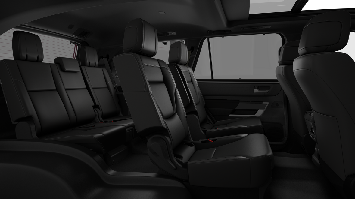 - Leather-trimmed 60/40 split, sliding, power-reclining, power fold-down third-row seats with adjustable headrests