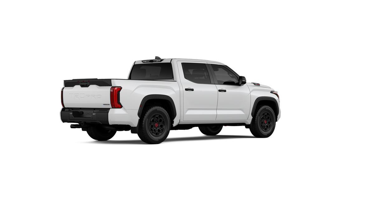 - "TRD PRO" hood badge; black door handles; black window molding and mirror caps; black technical-camo-grained tailgate spoiler and overfenders with marker lights